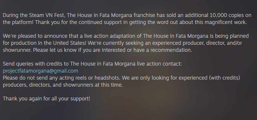 The critically acclaimed NOVECT visual novel “The House in Fata Morgana” seems to be getting a live-action adaptation soon, according to their Steam event news page.